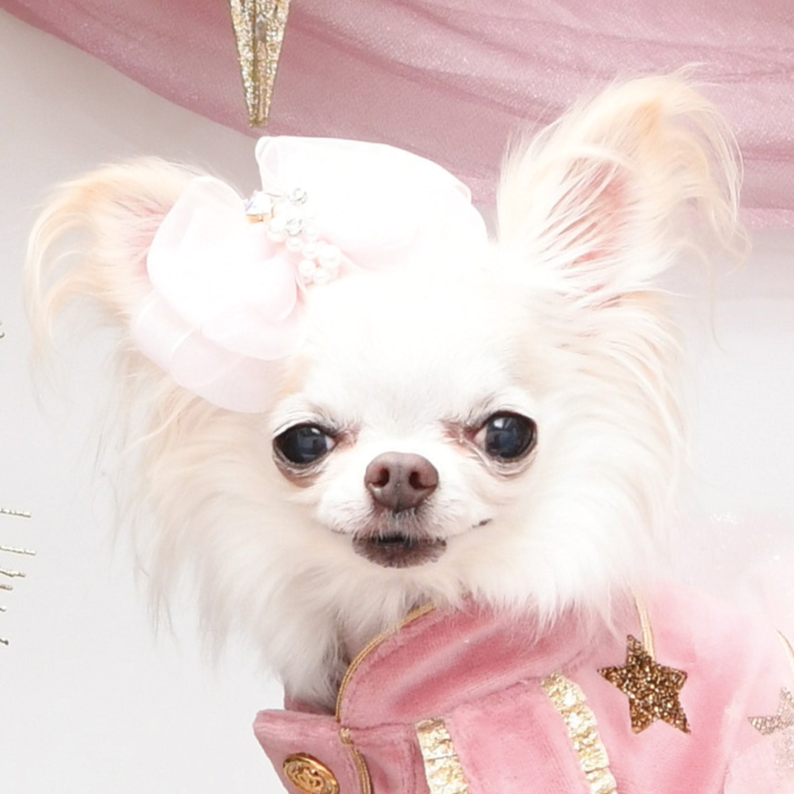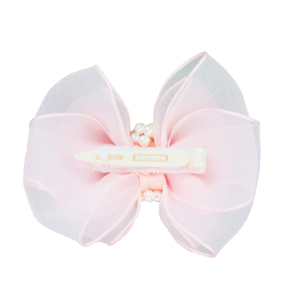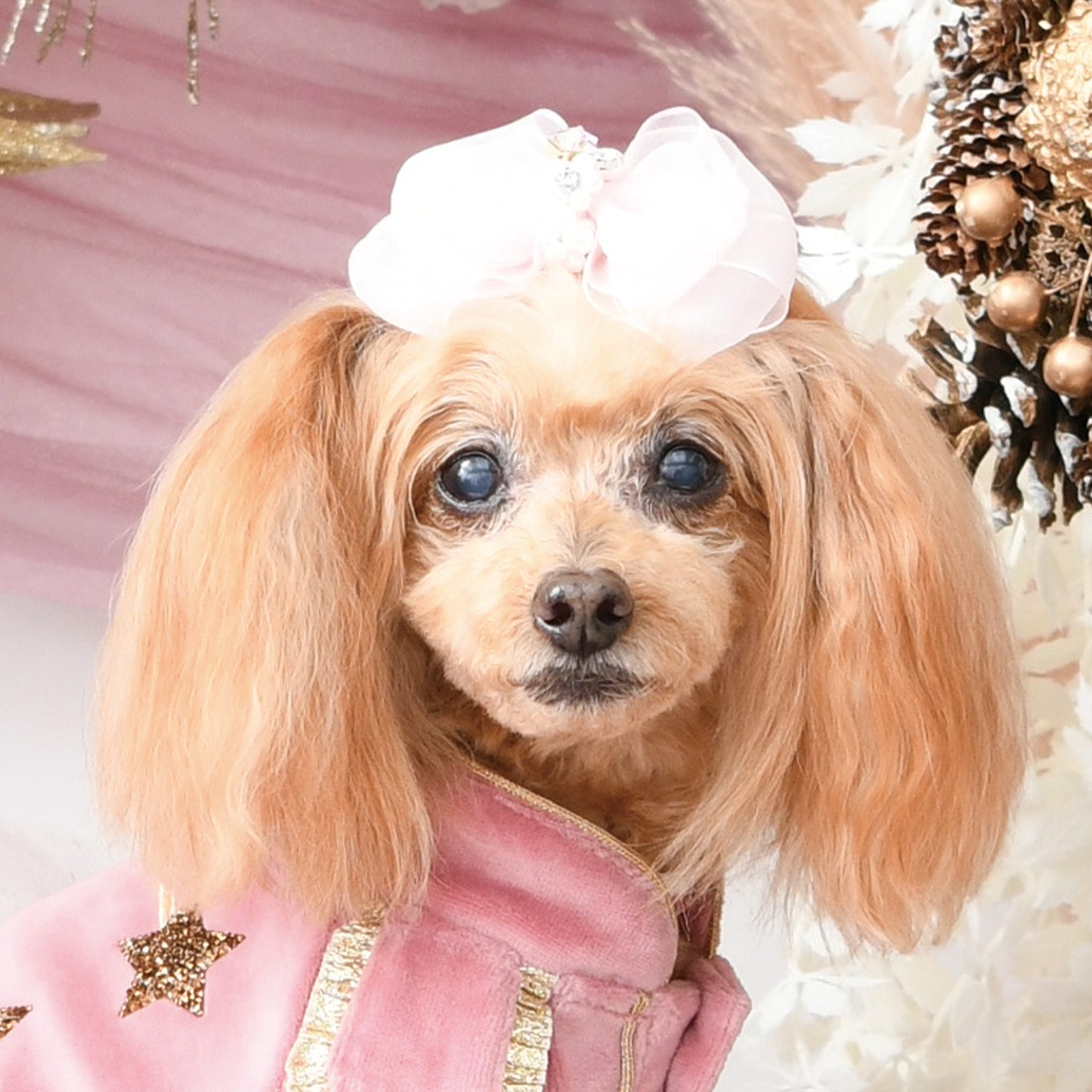 淡い色合いのふんわりとしたオーガンジーリボンにパールやビジューがぎゅっと詰まった上品で可憐なデザイン。