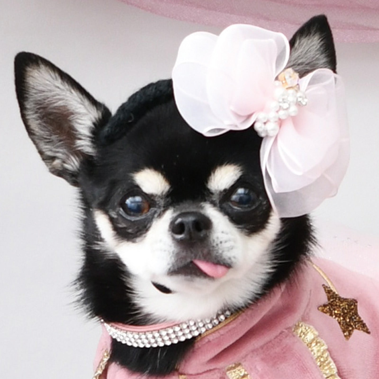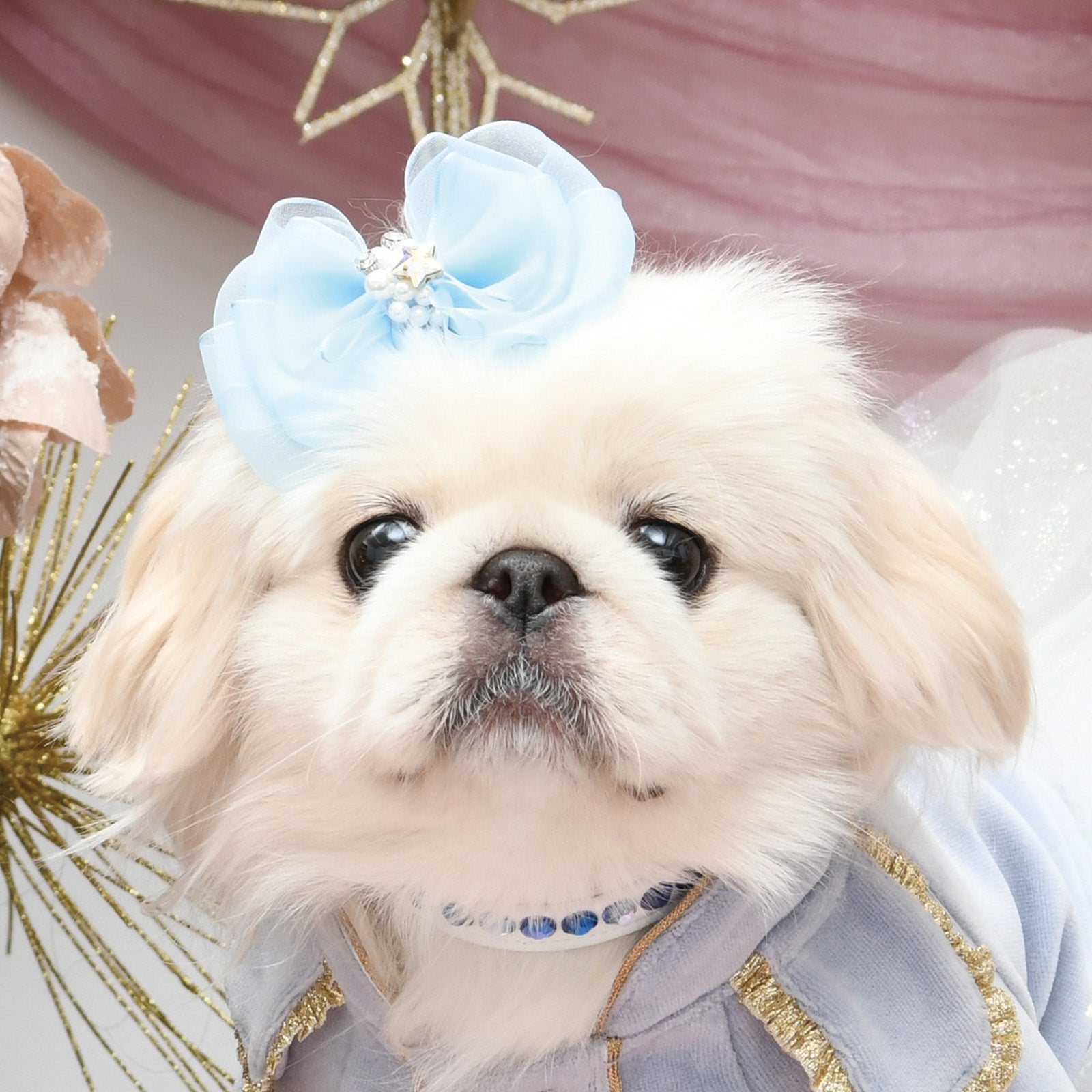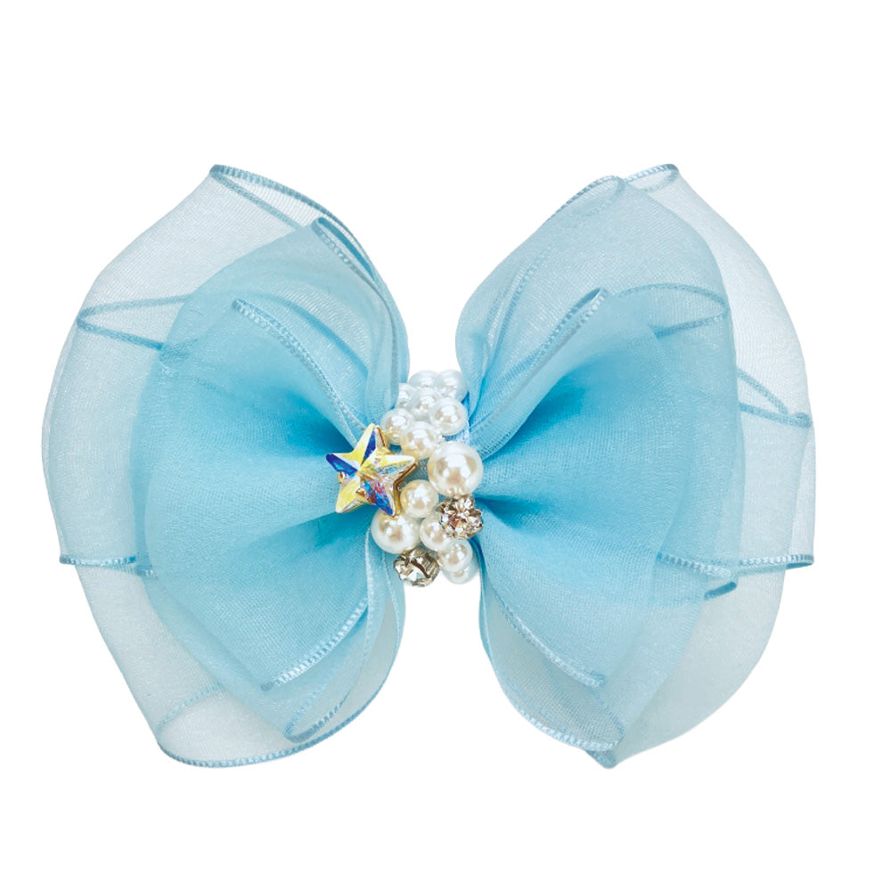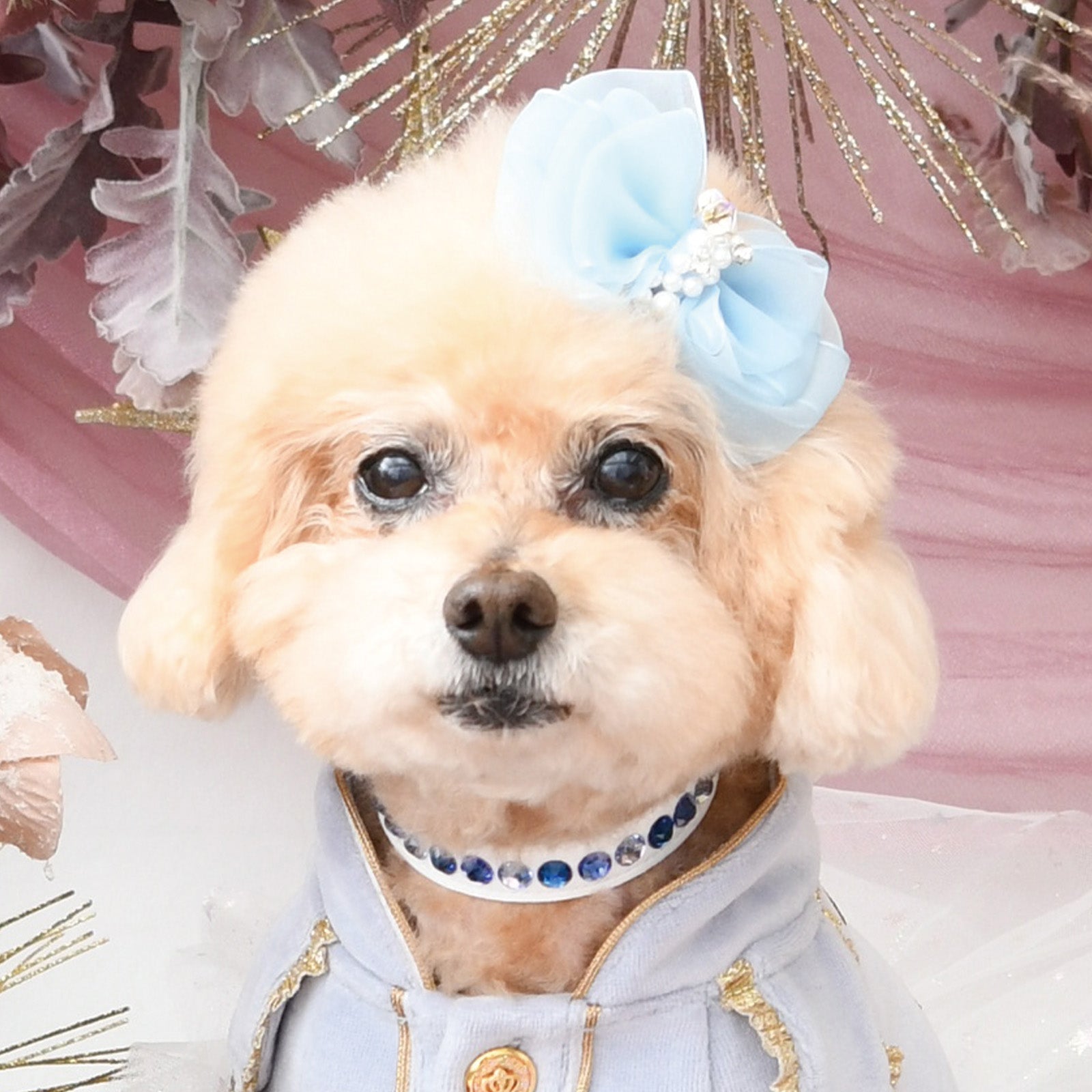 淡い色合いのふんわりとしたオーガンジーリボンにパールやビジューがぎゅっと詰まった上品で可憐なデザイン。