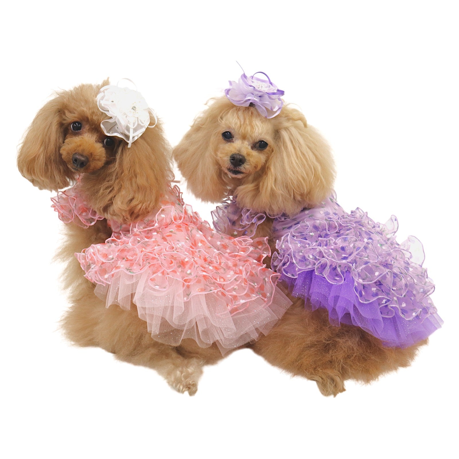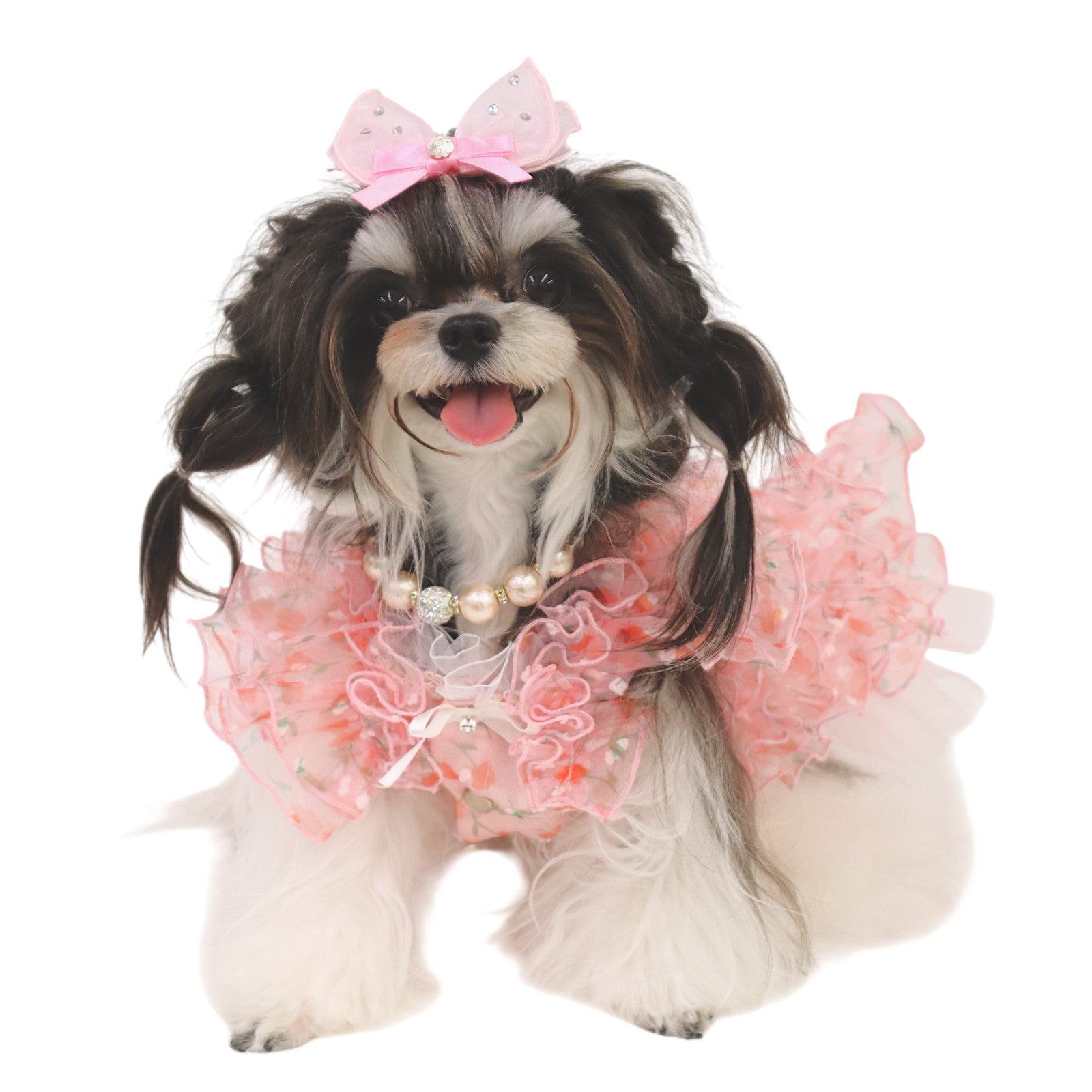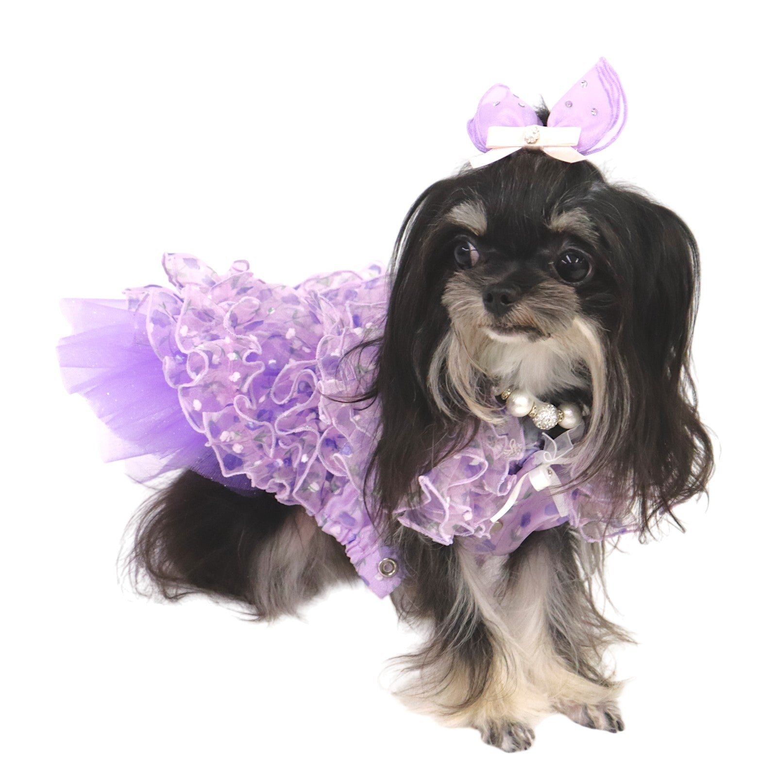 繊細な花柄プリントを施したシアー素材を贅沢に重ね、奥行きある表情を創出。透け感が軽やかな気品を静かに放ちます。 -