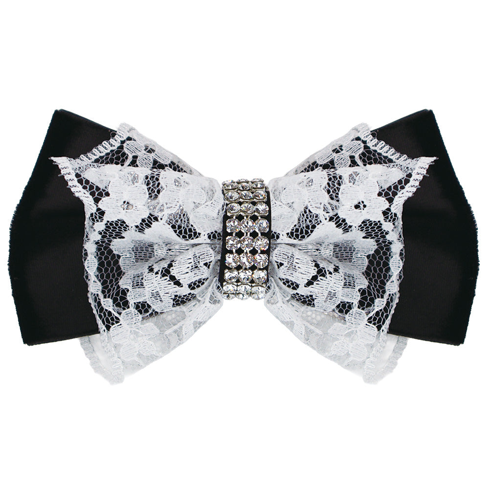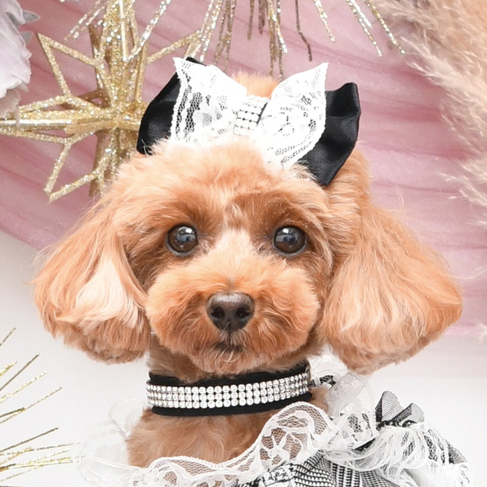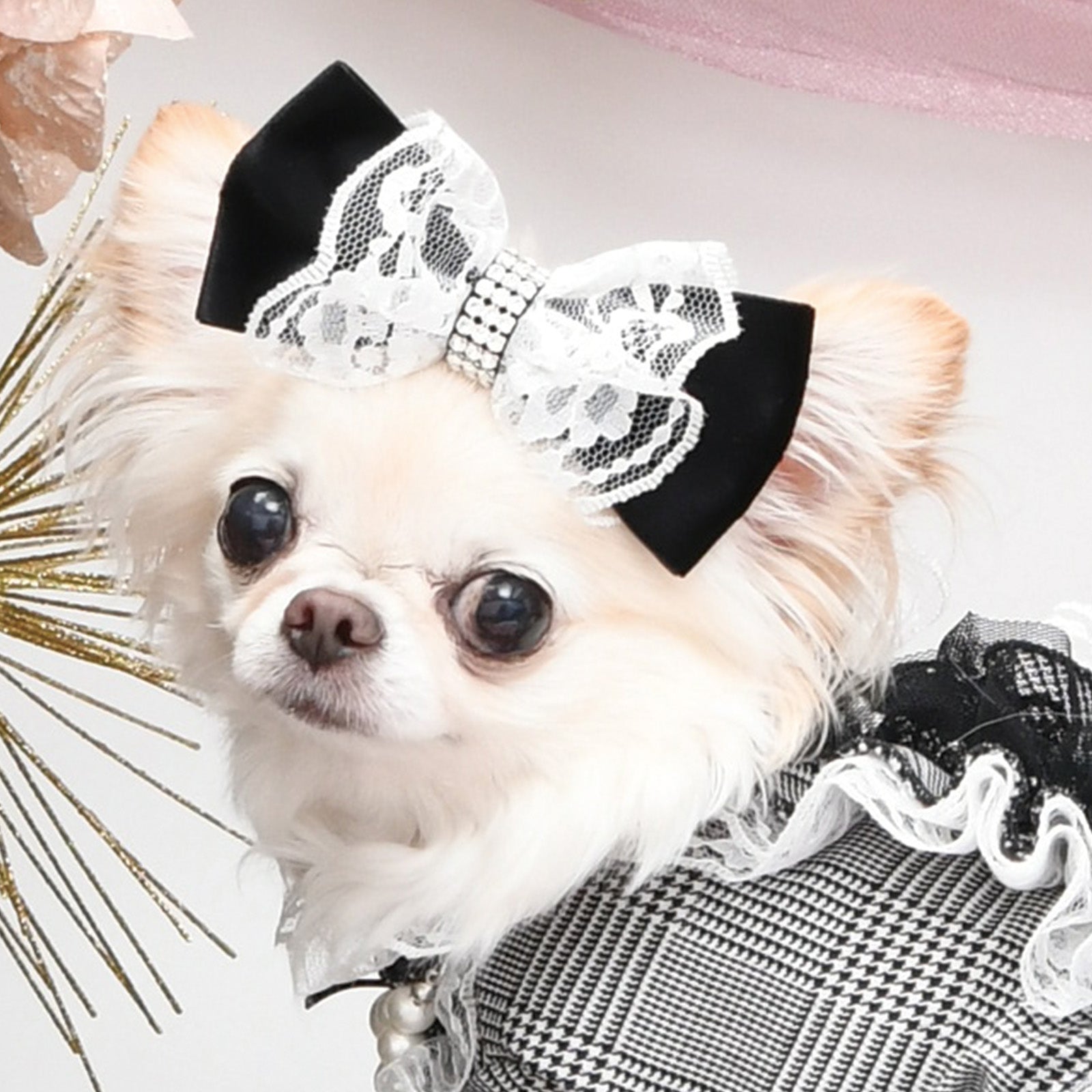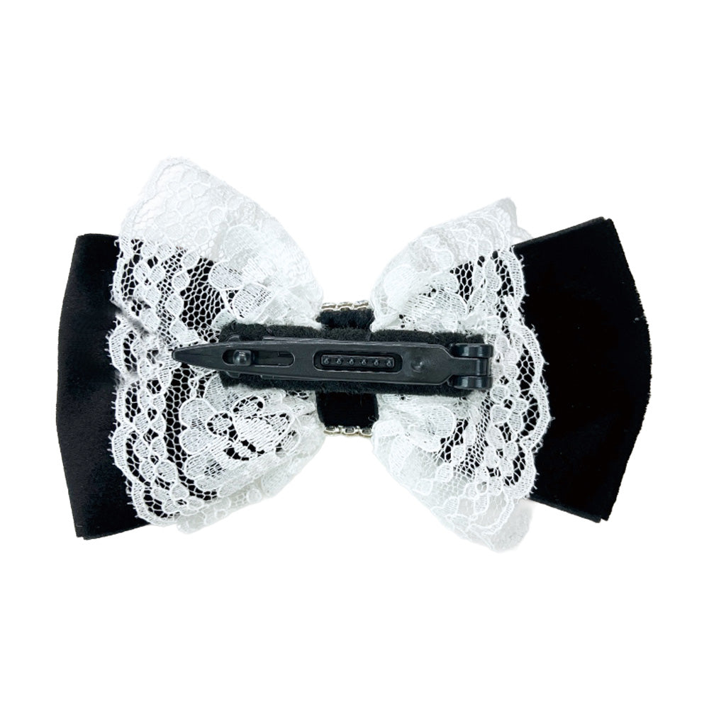 ブラックのベルベットリボンに、繊細な白レースを重ね、中央にはラインストーンを贅沢にあしらった上品なリボンバレッタ。