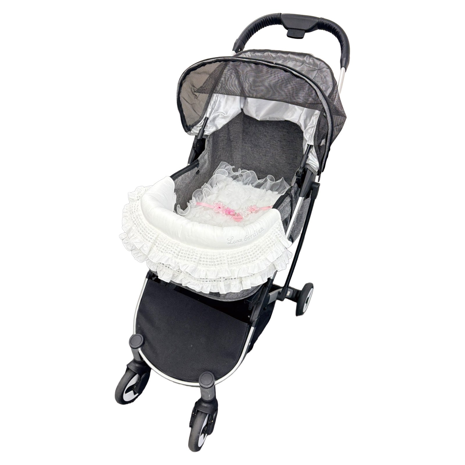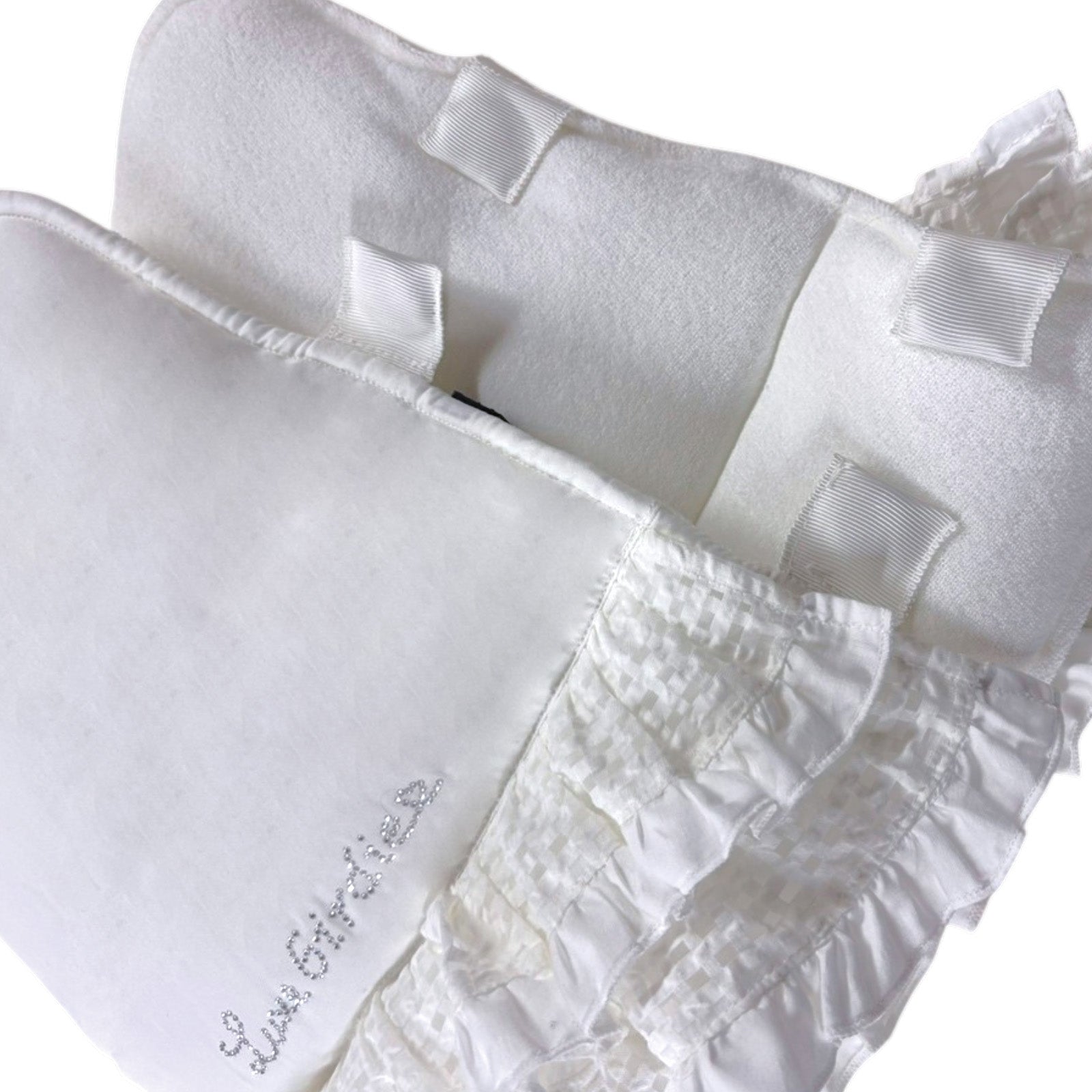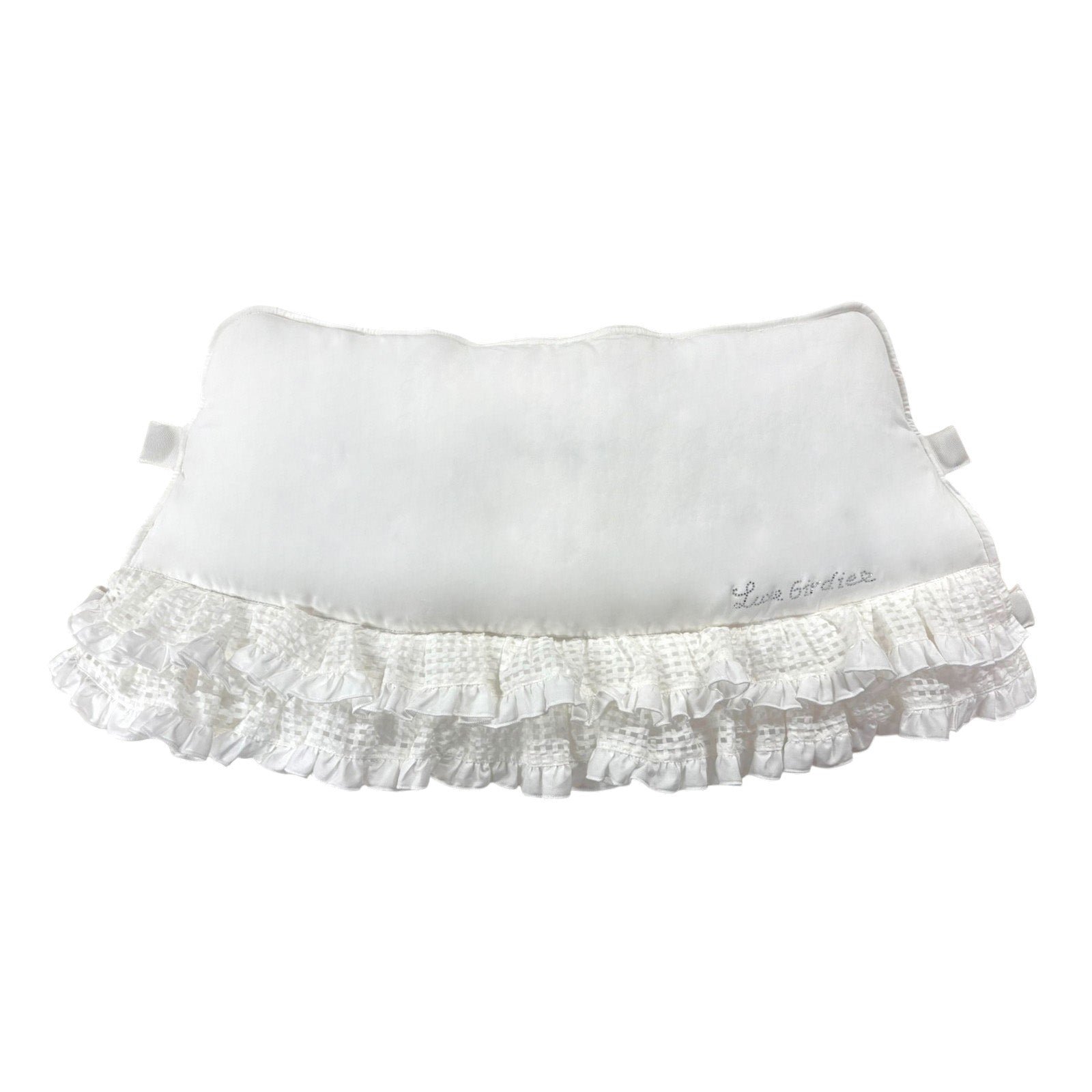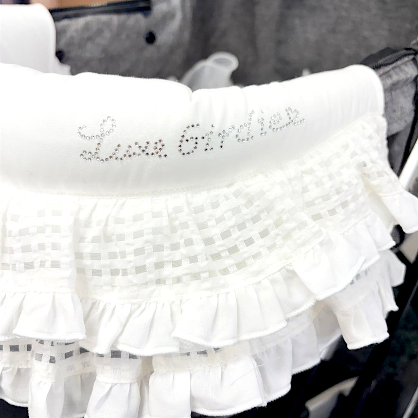 シアーなギンガムチェックフリルをまとったボディに、きらめくラインストーンロゴのワンポイントがアクセントです