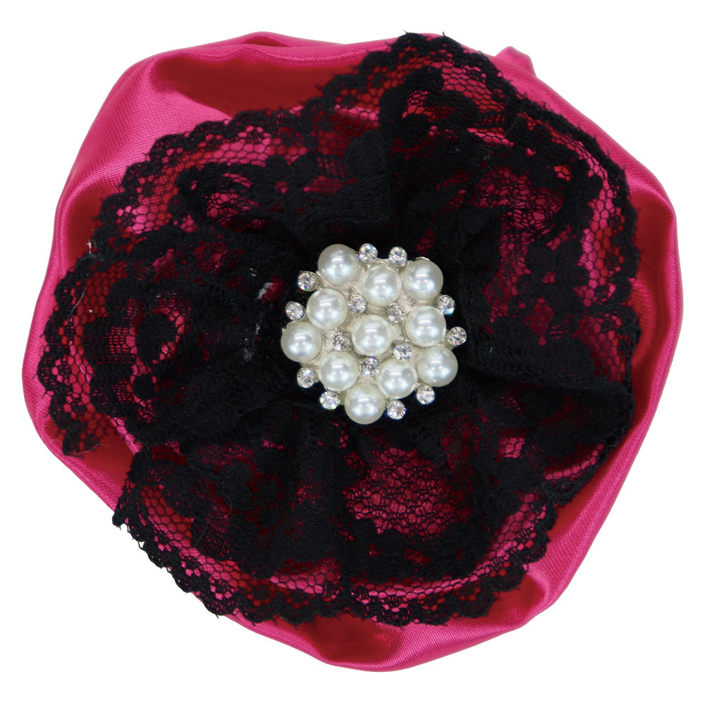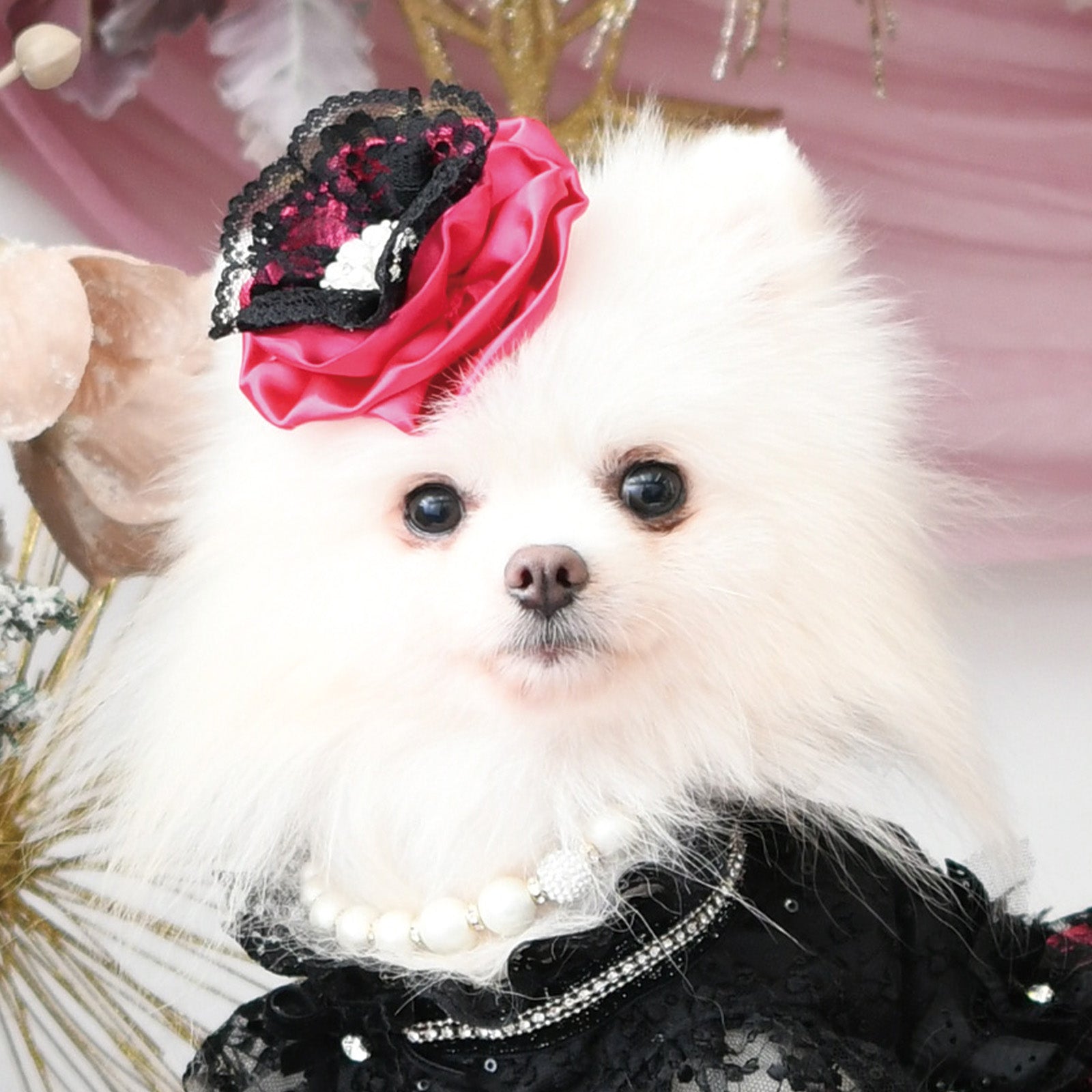 鮮やかなローズピンクに繊細な黒レースを重ね、中央にはパールとクリスタルで形作られた花モチーフが輝きます。