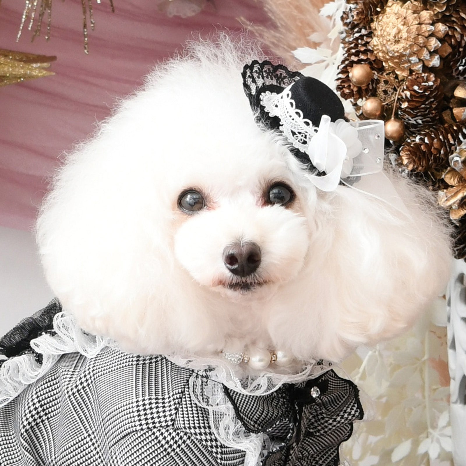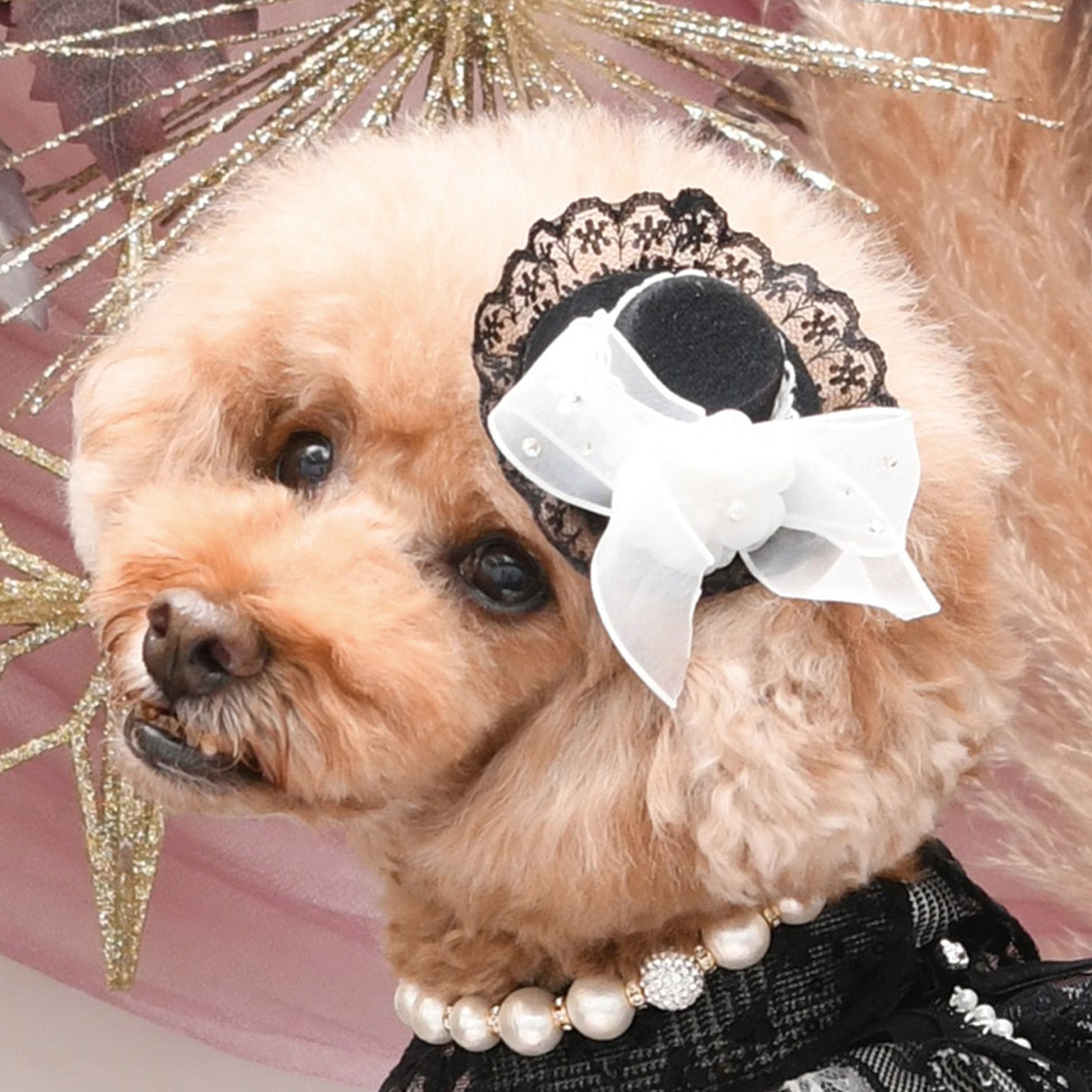 繊細なブラックレースにふんわりと咲く白いお花と軽やかなオーガンジーリボンをあしらったミニハット。