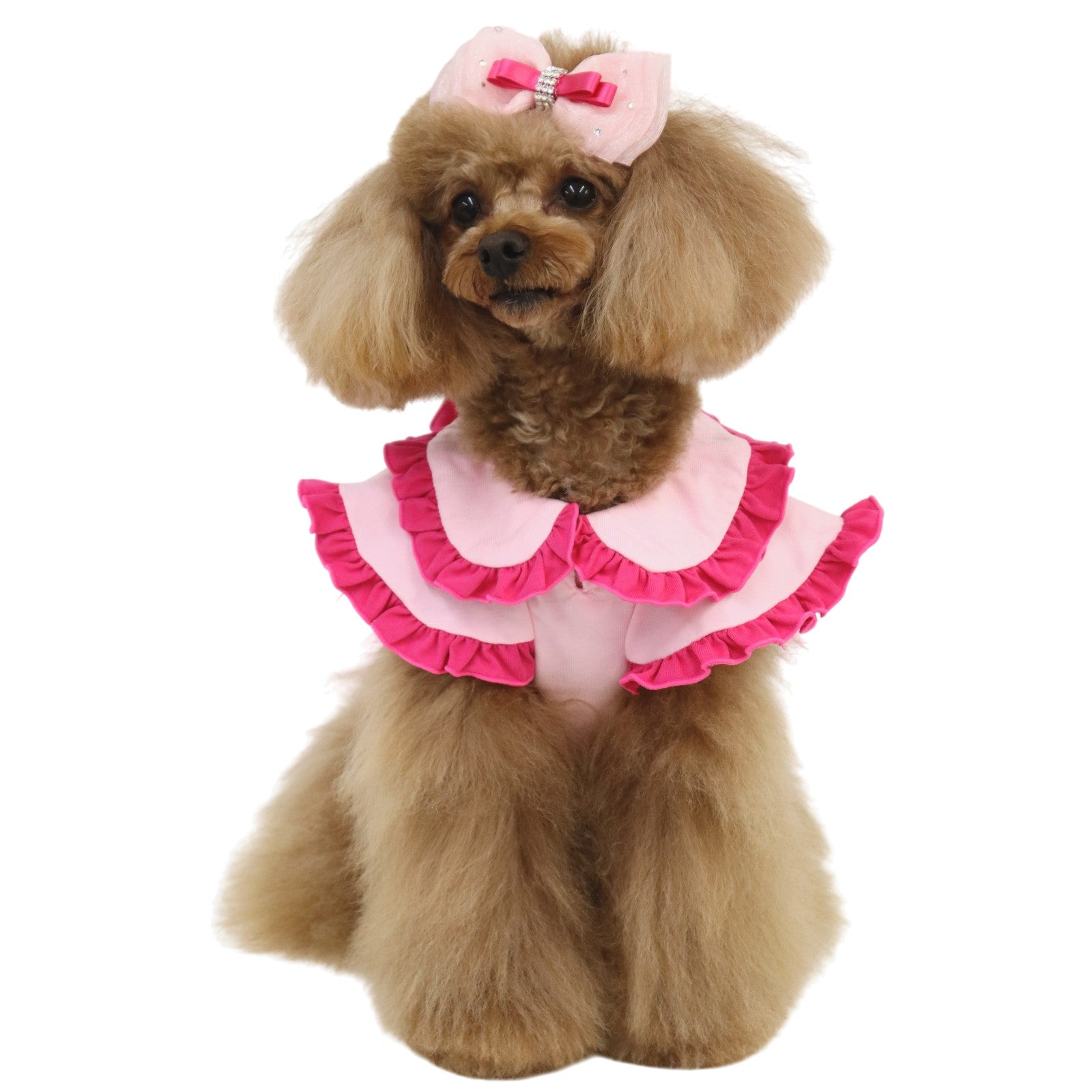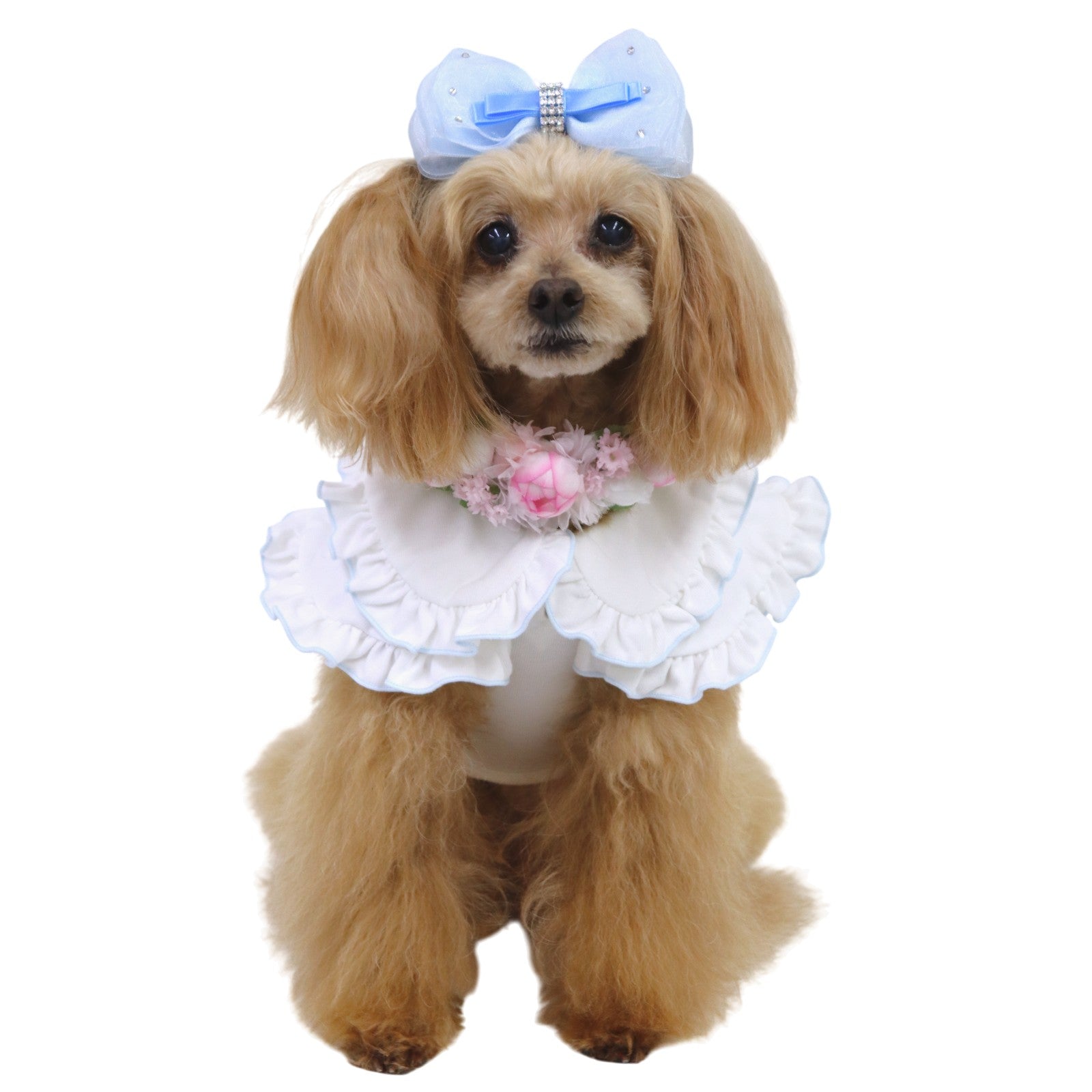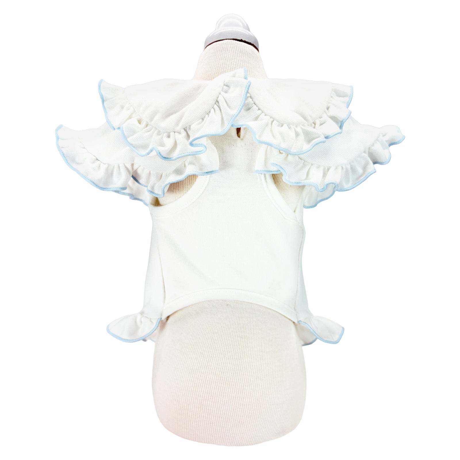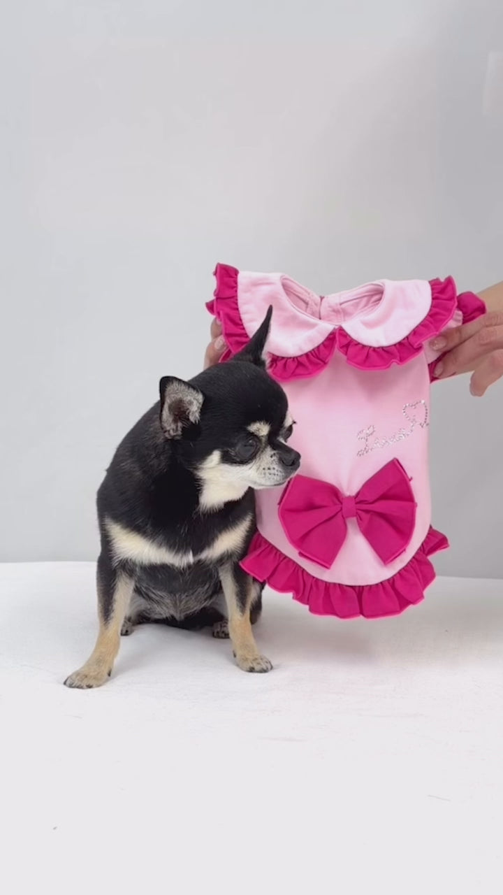 陽射しの下でも、静かな華やぎを忘れない。軽やかな涼感素材に、控えめな存在感を宿した一着です。 デザインの美しさ 優雅なダブルフリル襟肩から背へと連なる重なりフリルが、立体的な陰影を描きます。クラシックな丸襟が、凛とした愛らしさを添えます。 気品漂うカラー構成清らかなオールホワイトは静謐な佇まいを演出。バイカラーのピンクはコントラストが美しく、洗練された華やぎを静かに放ちます。 端正なウエストリボン背面にあしらった立体リボンが、後ろ姿まで美しく整えます。甘さを抑えた設計で、上質な印象を保ちます。 着心地・機能性 涼感タッチ素材触れた瞬間にひんやりと感じる接触冷感生地を使用。暑い日でも快適な着用感を叶えます。 UVカット機能紫外線を防ぐ素材設計により、陽射しの強い日のお出かけにも配慮。軽やかさと安心感を両立しています。 暑い季節にも、佇まいはあくまで優雅に。日常を格上げし、愛犬の姿をいっそう美しく整える一着です。 *こちらの商品は、他のドレス等と比べて伸縮性のある素材を使用しております。サイズ表には「伸ばしていない状態(最小サイズ)」を記載しておりますので、 実際にはそこから柔らかく伸びる仕様でございます。