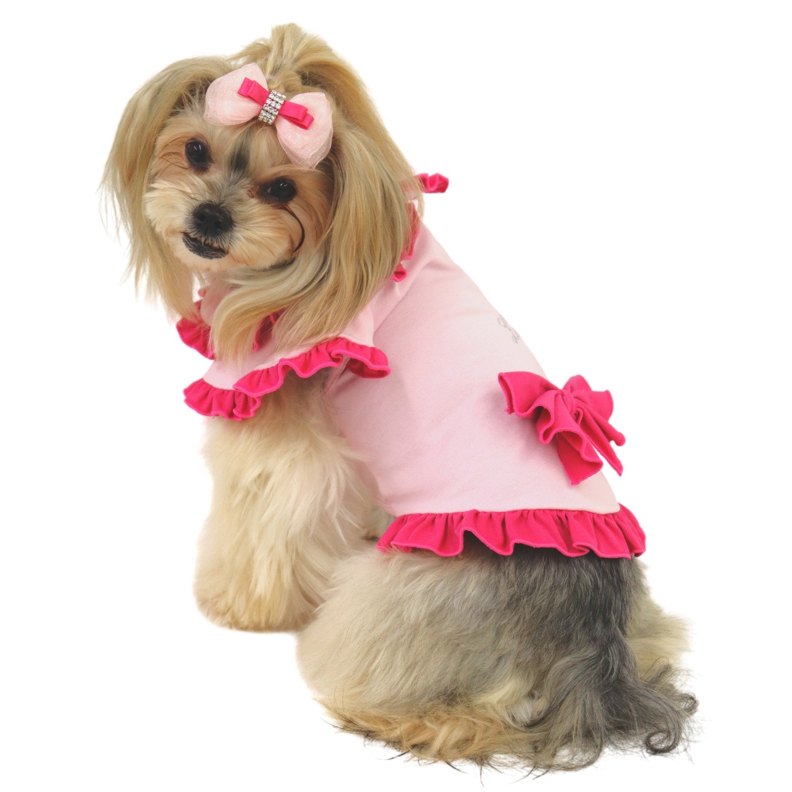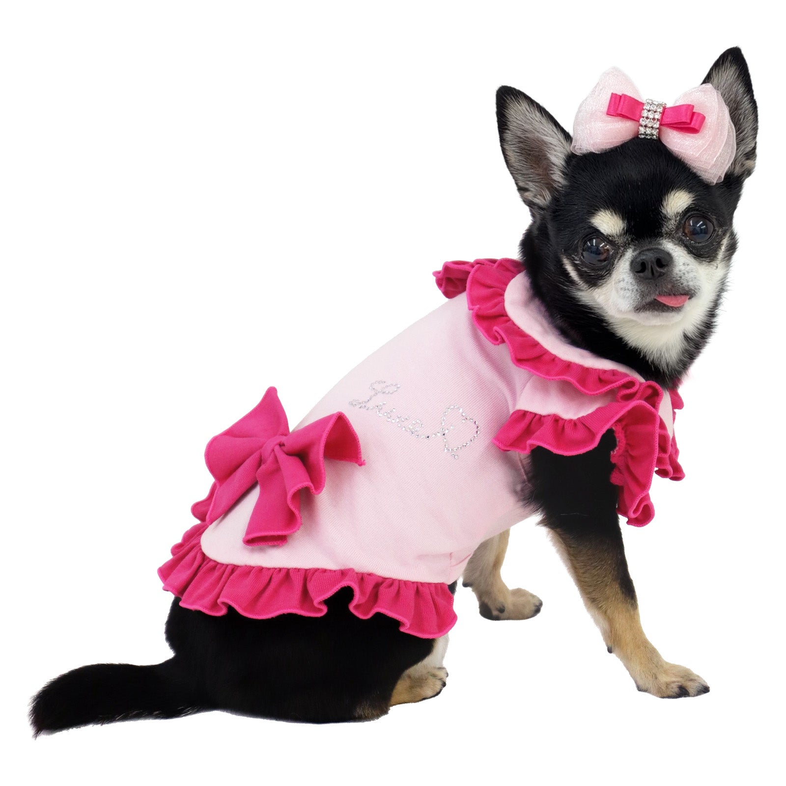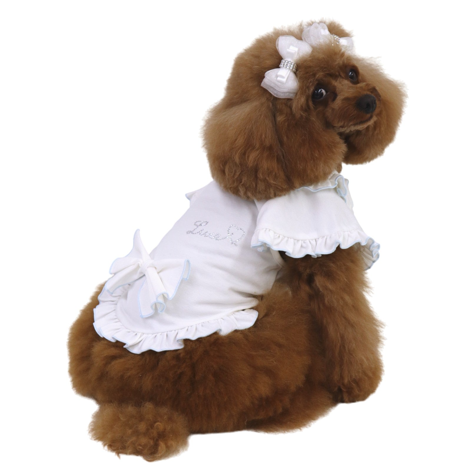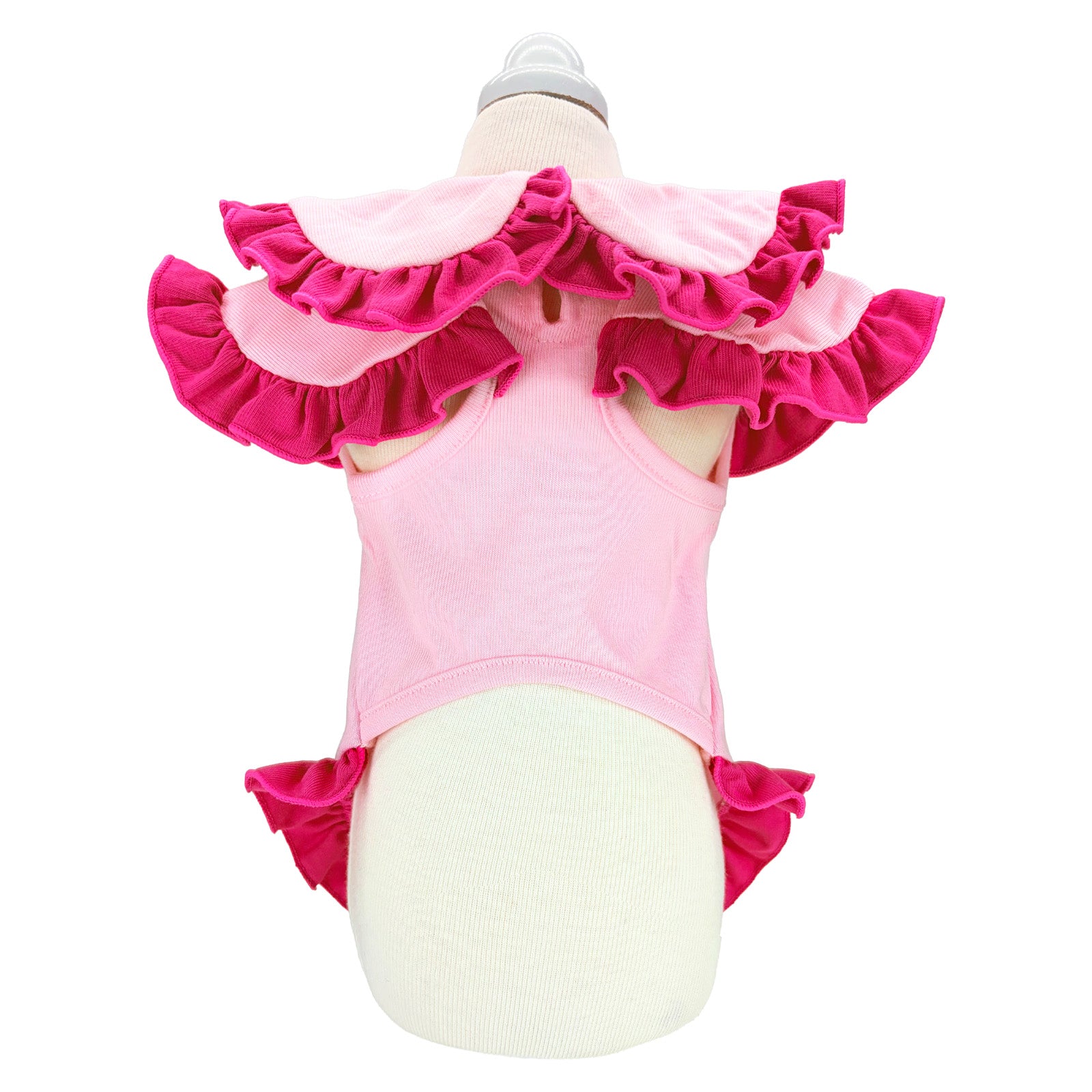 陽射しの下でも、静かな華やぎを忘れない。軽やかな涼感素材に、控えめな存在感を宿した一着です。 デザインの美しさ 優雅なダブルフリル襟肩から背へと連なる重なりフリルが、立体的な陰影を描きます。クラシックな丸襟が、凛とした愛らしさを添えます。 気品漂うカラー構成清らかなオールホワイトは静謐な佇まいを演出。バイカラーのピンクはコントラストが美しく、洗練された華やぎを静かに放ちます。 端正なウエストリボン背面にあしらった立体リボンが、後ろ姿まで美しく整えます。甘さを抑えた設計で、上質な印象を保ちます。 着心地・機能性 涼感タッチ素材触れた瞬間にひんやりと感じる接触冷感生地を使用。暑い日でも快適な着用感を叶えます。 UVカット機能紫外線を防ぐ素材設計により、陽射しの強い日のお出かけにも配慮。軽やかさと安心感を両立しています。 暑い季節にも、佇まいはあくまで優雅に。日常を格上げし、愛犬の姿をいっそう美しく整える一着です。 *こちらの商品は、他のドレス等と比べて伸縮性のある素材を使用しております。サイズ表には「伸ばしていない状態(最小サイズ)」を記載しておりますので、 実際にはそこから柔らかく伸びる仕様でございます。